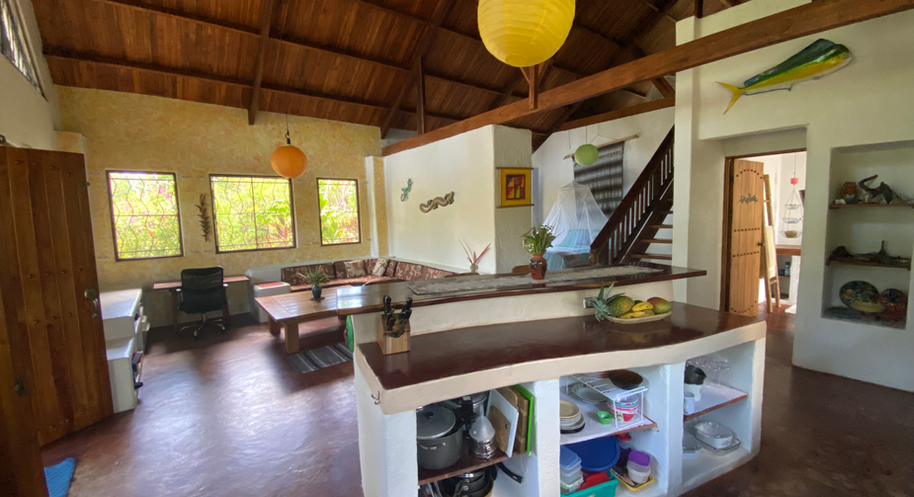 This charming 2 bedroom, 1 bath home is located on a quiet beach access road in the tranquil Sombrero neighborhood. Constructed with cement block and hardwoods, the house has been meticulously maintained and is in excellent shape. With an open floor plan and high ceilings, the home maximizes airflow to stay cool. The bathroom features his and her sinks, as well as an airy outdoor shower. The primary bedroom, located on the main floor, contains a queen size bed along with built-in shelving and closet space. A large, lofted area offers additional sleeping space with a double bed plus room for additional beds, if desired. The attached bodega, just behind the house, contains a washer dryer and serves as a secure space to store belongings. A spacious patio off the front of the house is the perfect place to relax in the hammock or enjoy a cup of coffee while watching the wildlife pass by. Sombrero beach, a short walk from the house, is pristine and uncrowded.